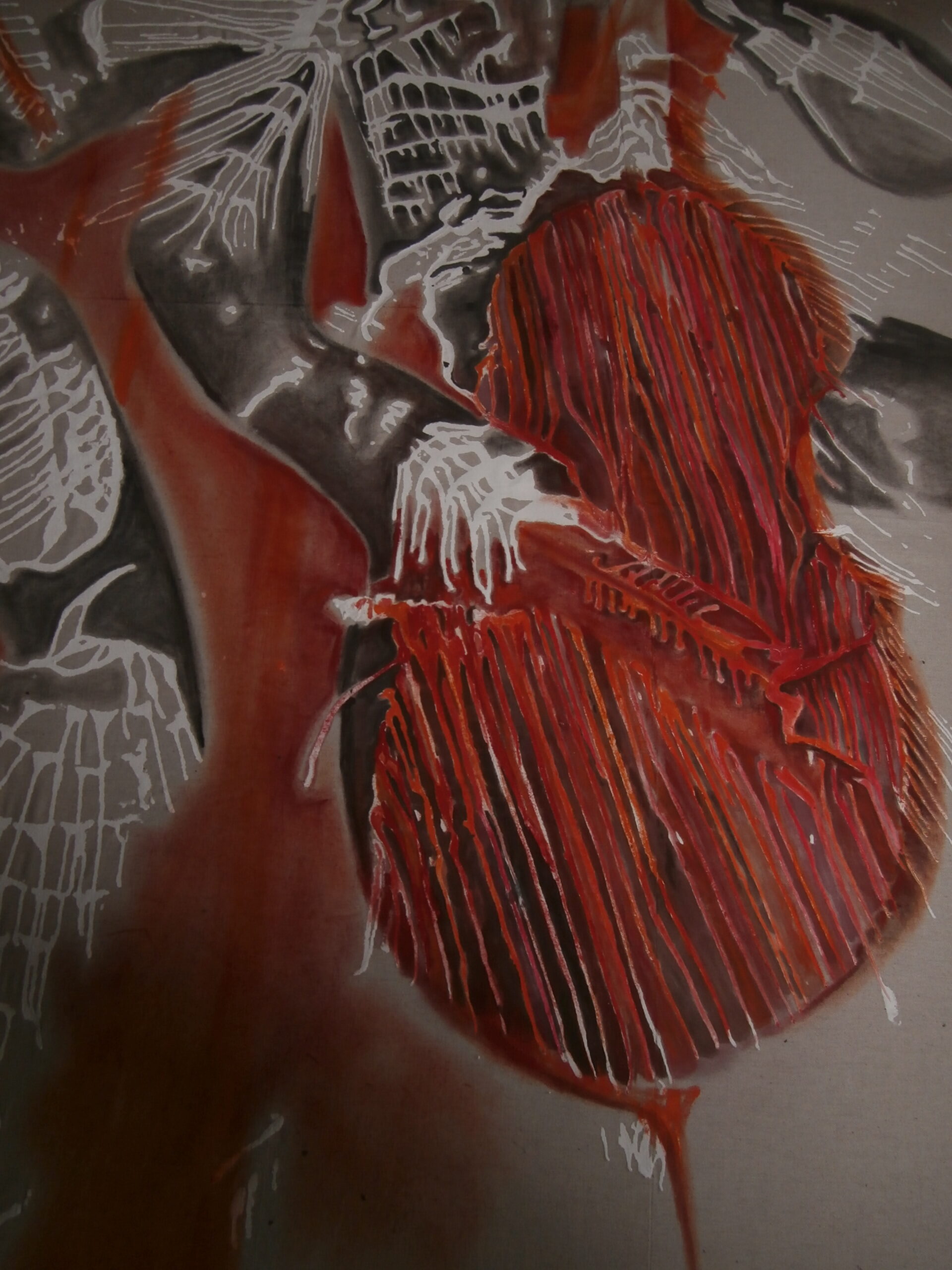 Après lui avoir parlé de mon projet, elle accepta d’y participer. Le rendez-vous fut pris : le groupe Quintile viendrait à mon atelier au Moulin Trumeau et devant les autres Delphine, son violoncelle et moi ferions la performance ; Tout cela était sans compter les problèmes techniques liés à la mise en place de l’installation. D’un seul tenant de tissu-environ 2m de large- draper Delphine sans préparation en position de jouer sur le violoncelle tout en protégeant ce dernier d ‘éventuelles traces de peinture, cela relevait d’un défi difficile à affronter. Après de nombreuses hypothèses infructueuses de mise en place je renonçais à travailler pour une fois sur »le Vivant’ ‘et optais pour un substitut. Je remis en situation mon vieux mannequin, confectionnais un violoncelle de fortune via les photos d’instruments sur internet que j’agrandis à échelle humaine et ainsi mis en place le groupe tant souhaité. Bien que l’enveloppement de l’ensemble s’avère difficile je parvins à positionner le personnage et le violoncelle. La répartition des coulures, sur les volumes crée, pour une fois fut sereine, j’insistais sur l’instrument offrant une belle surface inclinée propice aux écoulements de la peinture. Deux jours furent nécessaires au séchage. Une fois la toile tendue au sol, je pouvais enfin commencer la peinture :la couleur ; son registre je l’ai choisi dans les rouges sombres des terres de Sienne aux laques Rouges carminées entrecoupées de fulgurances roses ; couleurs propres à évoquer la relation sourde et profonde entre l’homme et son instrument.