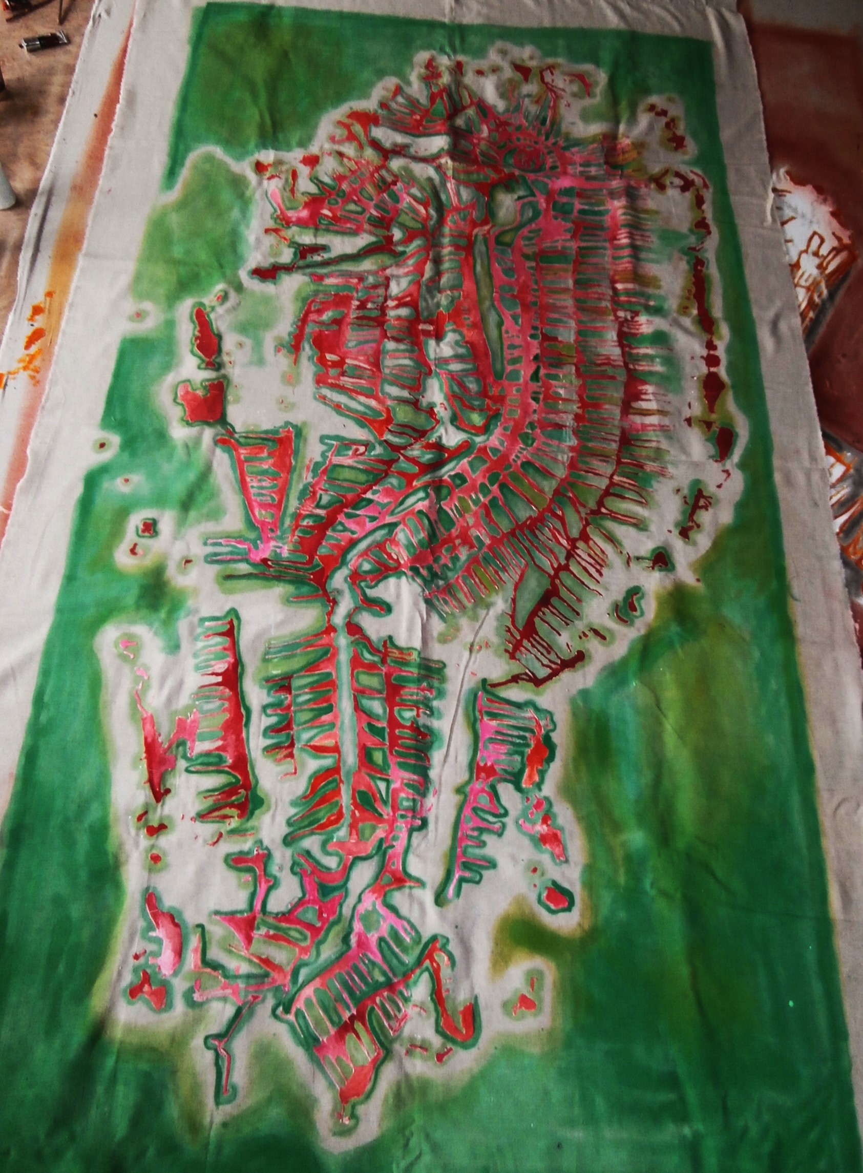 Quelques minutes après chacune prenant les deux coins de la toile à bout de bras, nous l’avons soulevée et déposée au sol à côté. Christian s’ébroua et m’assura de sa complète sérénité lorsqu’il sentait le passage de la peinture.